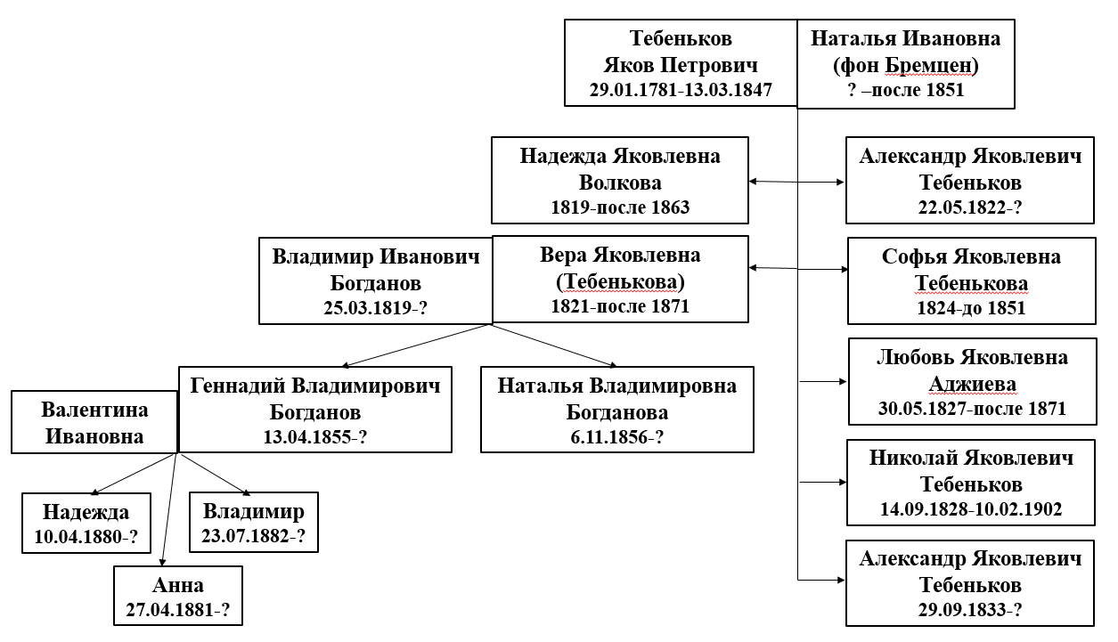 Тебенькову за службу было пожаловано 2000 десятин земли, но имение в Карташихе ему не принадлежало. Хозяйкой была его жена – Наталья Ивановна Тебенькова , урожденная фон Бремцен , дочь какого-то лифляндского помещика (Лифляндия – ныне территория Латвии и Эстонии). Они венчались 11.02.1811 г. по православному обряду [4] . В Дворянскую родословную книгу Казанской губернии в 1842 году были внесены имена их детей Веры, Александра, Софьи, Любови, Николая и ещё одного Александра. Точные даты рождения указаны лишь у 4-х из них.