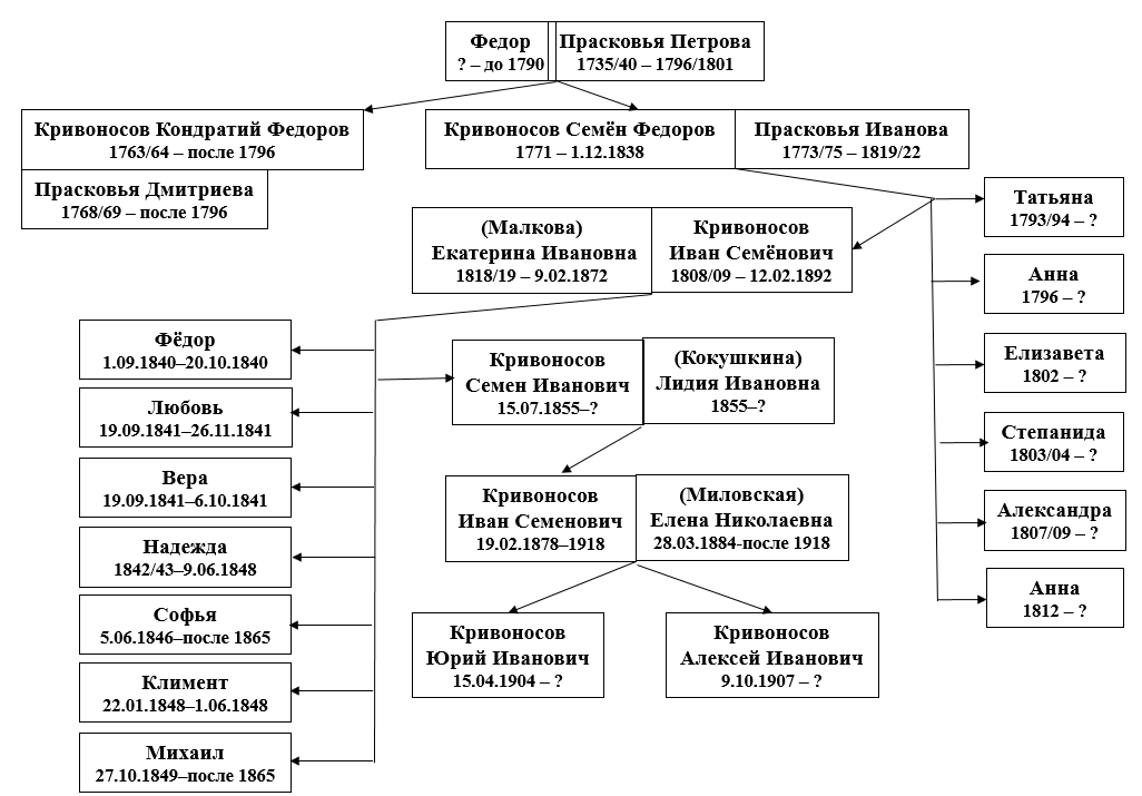 Кондратий Федорович уже в 1790 году был женат, но дети у него, видимо, так и не появились. Семен Федорович женился примерно в 1793 году. Во всяком случае, в исповедной ведомости 1801 года [9] у него уже записаны жена Прасковья Ивановна и две дочери – Татьяна 8 лет и Анна 5 лет. К 1810 году [10] в доме Кривоносовых осталась только сильно увеличившаяся в размере семья Степана Федоровича. Появились дочери Елизавета, Степанида и Александра, и наконец, долгожданный сын Иван. После Ивана родилась ещё одна дочь Анна. Прасковья Ивановна умерла примерно в 1820 году, а Семена Федоровича не стало в 1838-ом [11].