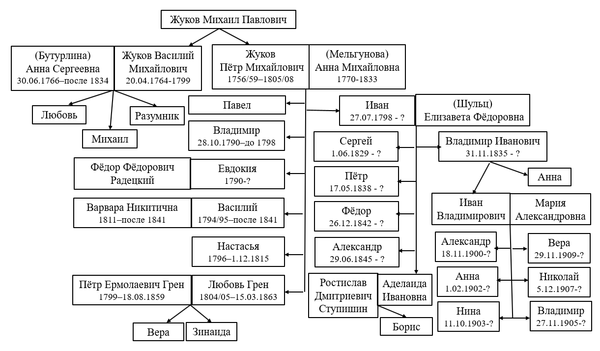 Итак, отцом Василия и Петра Михайловичей Жуковых был всё-таки Михаил Павлович. Документ [15] позволяет назвать ещё три поколения их предков и показывает боковые ветви рода.